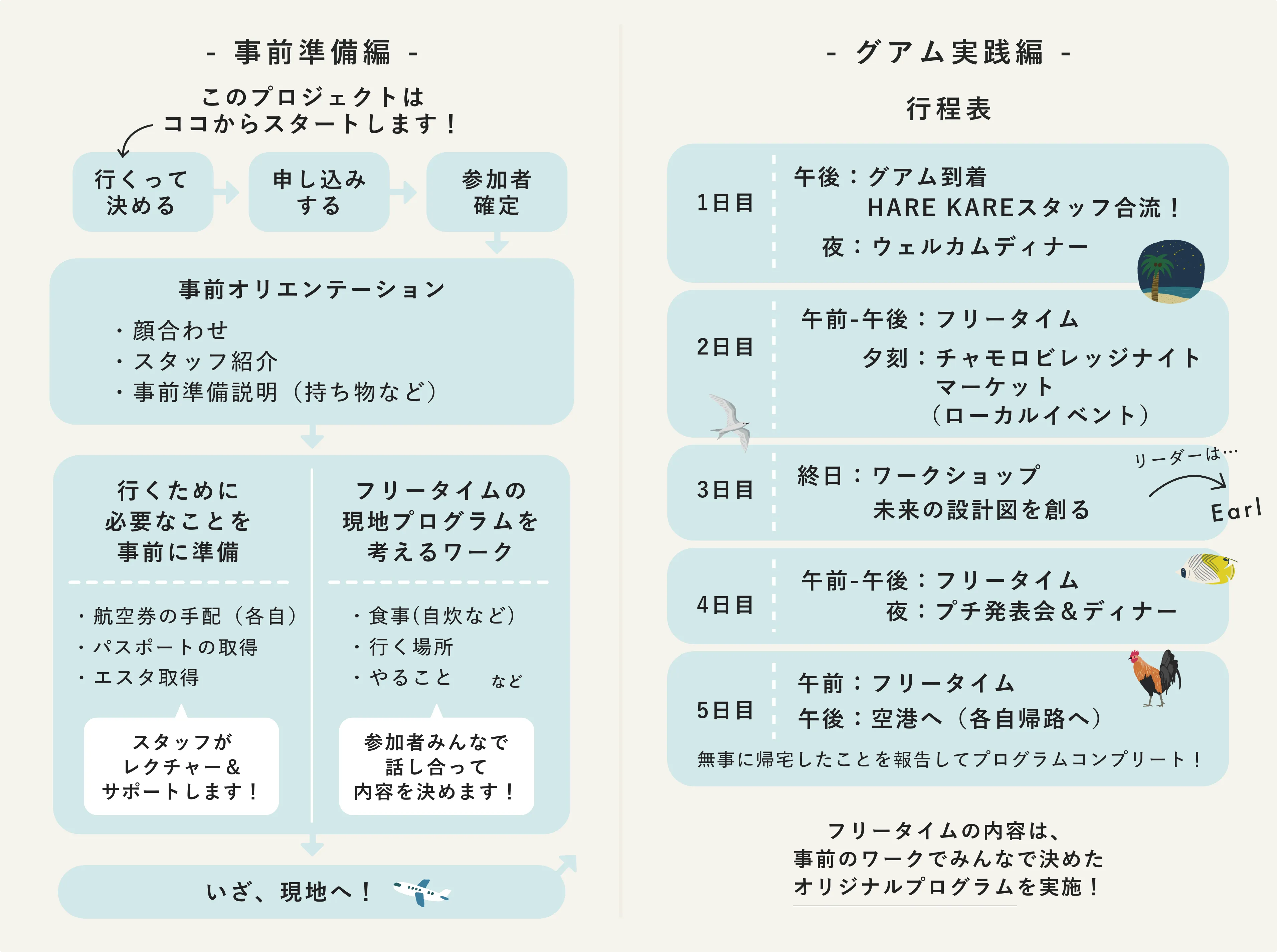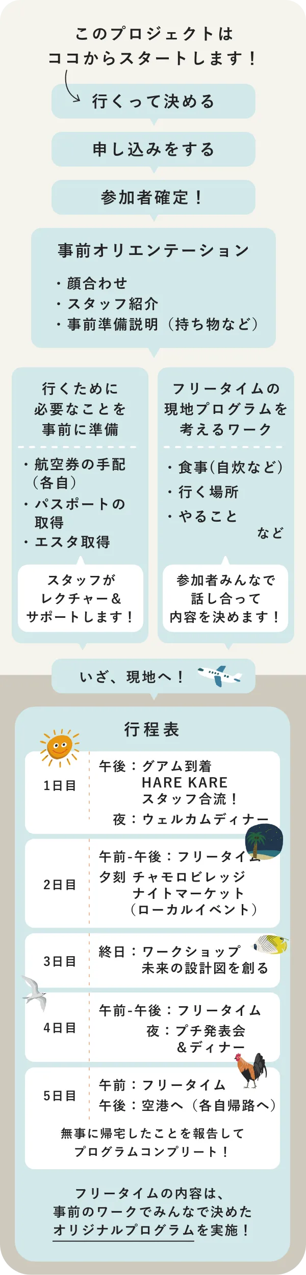 慣れ親しんだ環境ではないグアムで、仲間と時間を共にしながら未来を創作する体験は、HARE KAREにしか提供できないプログラムです。